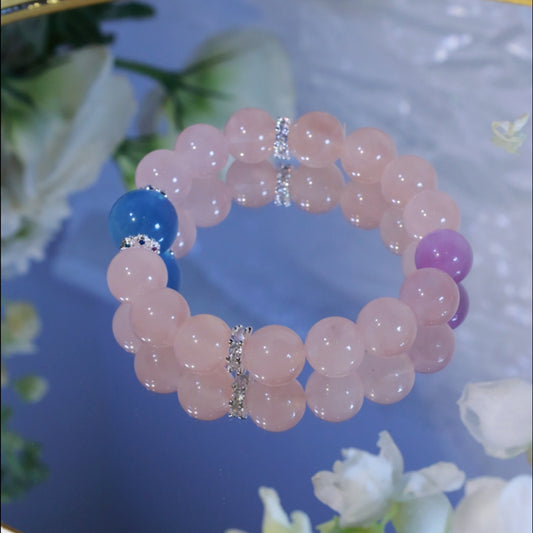 "Ocean's Whisper & Blush " - Aquamarine Crown & Rose Crystal & Kunzite Beaded Bracelet